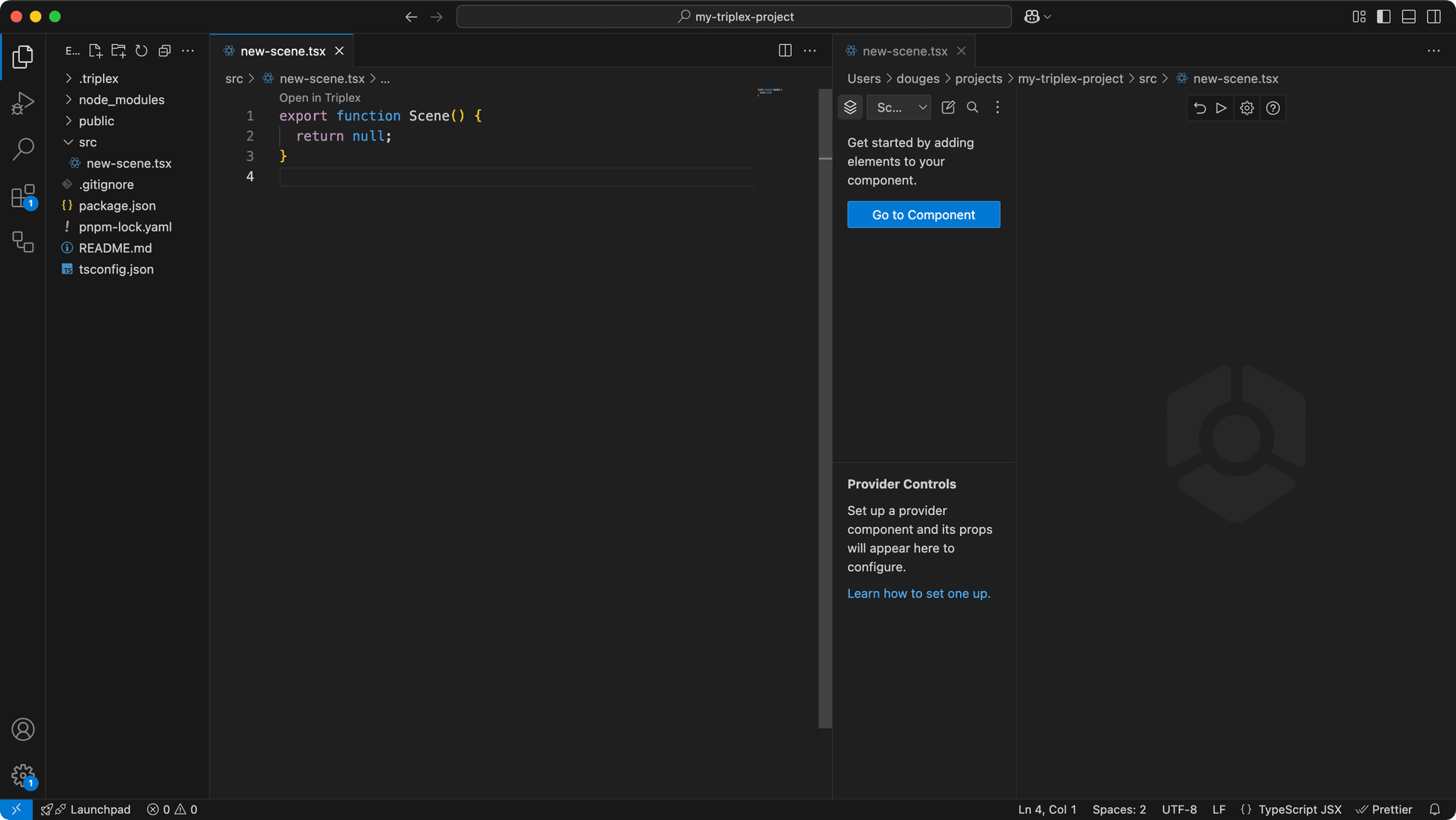 3. Click the Open in Triplex CodeLens action above the Scene component. Nothing will appear in the scene yet.
