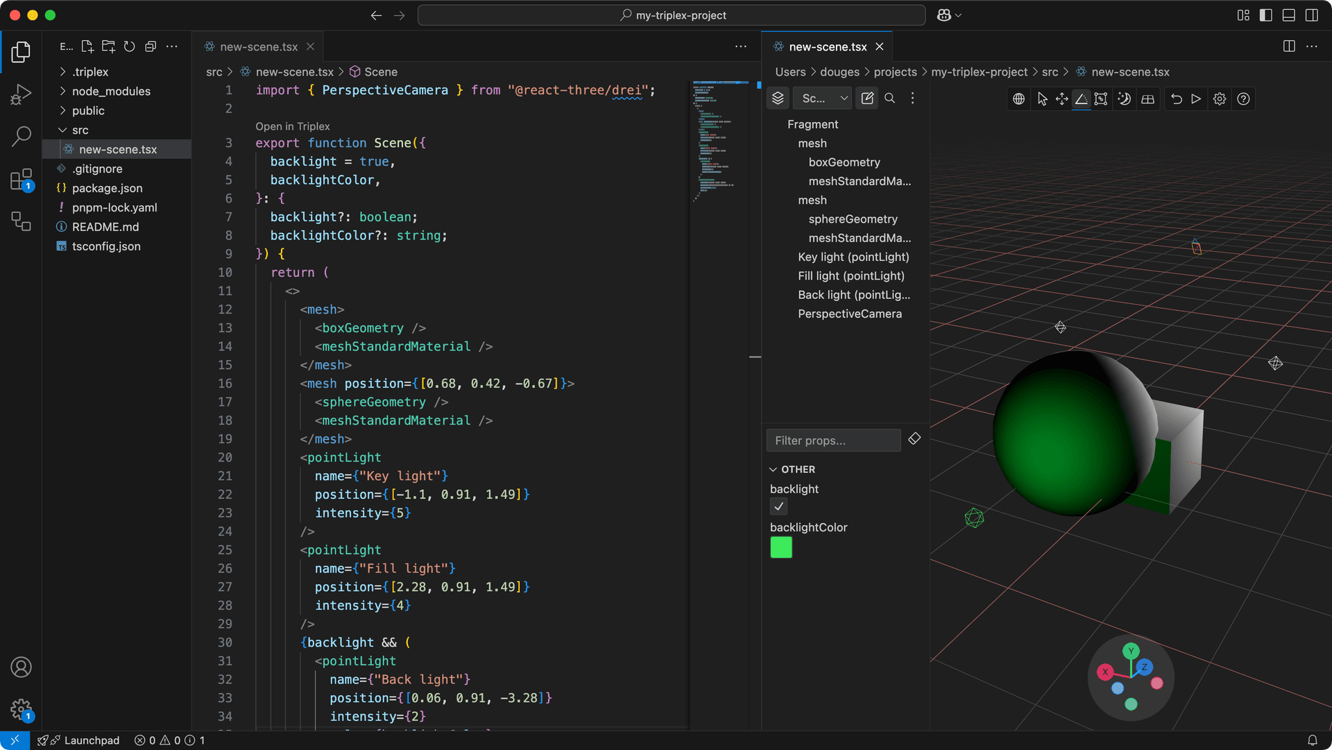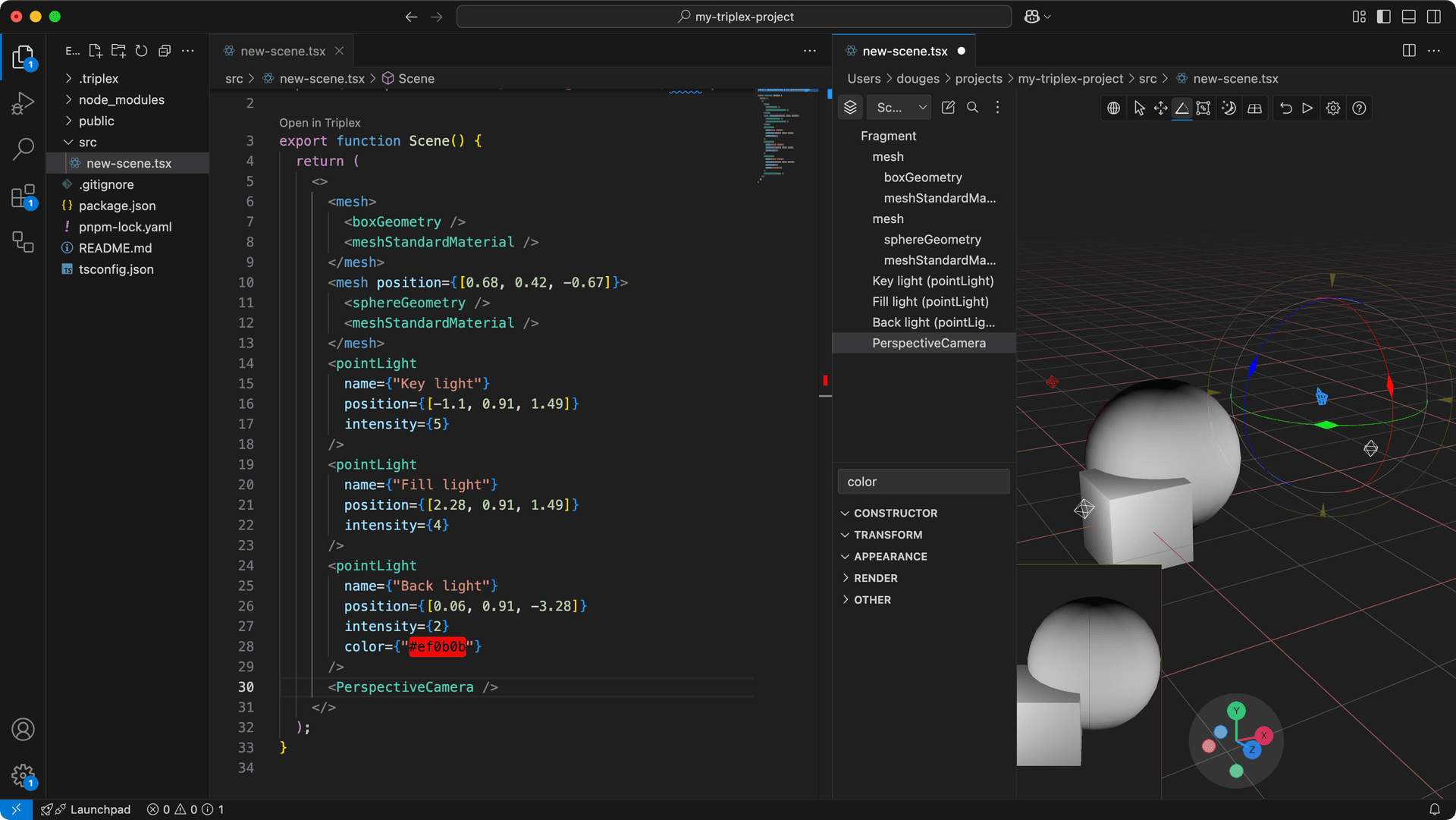 2. Copy the highlighted code into your component then jump back into Triplex for VS Code. A camera will appear in the scene.